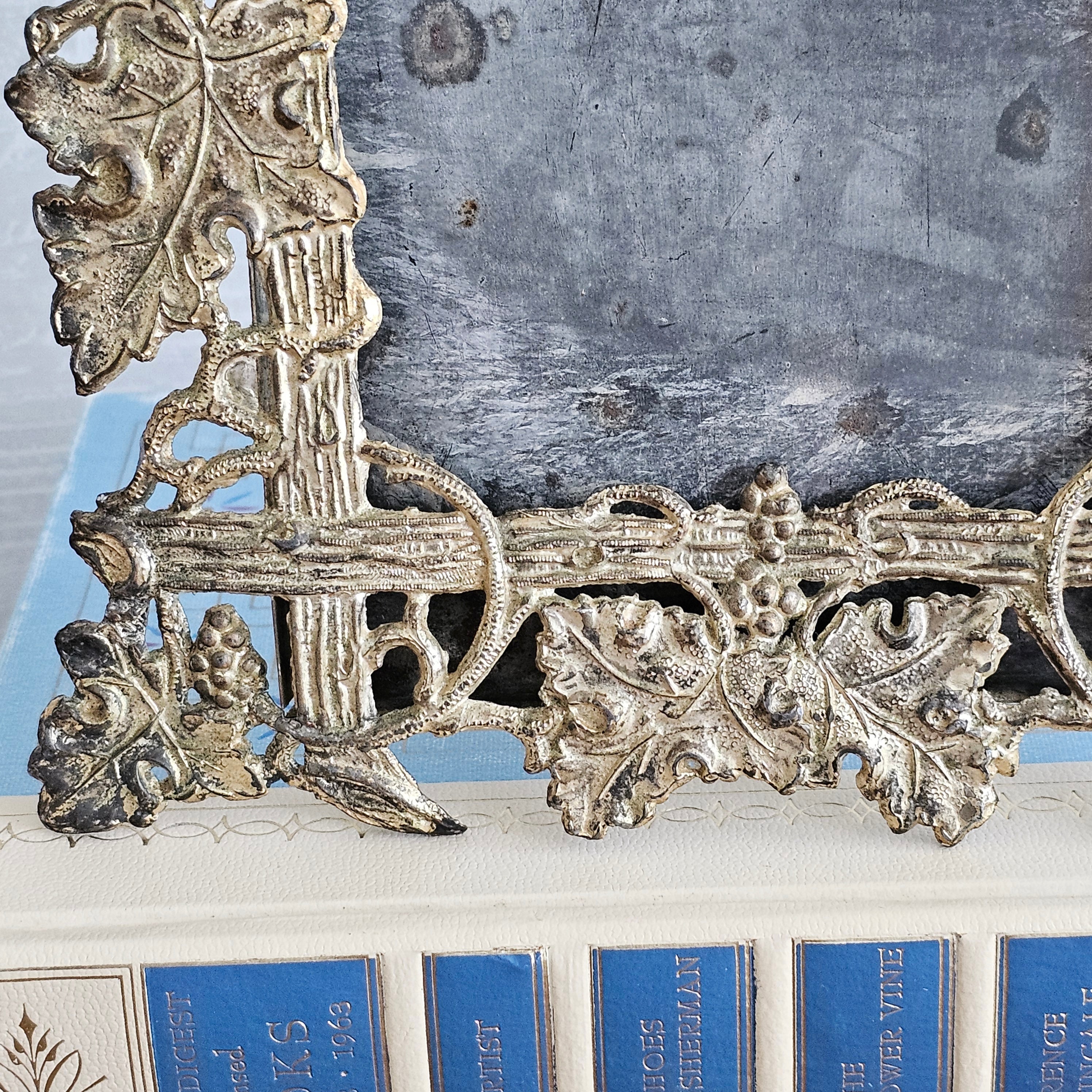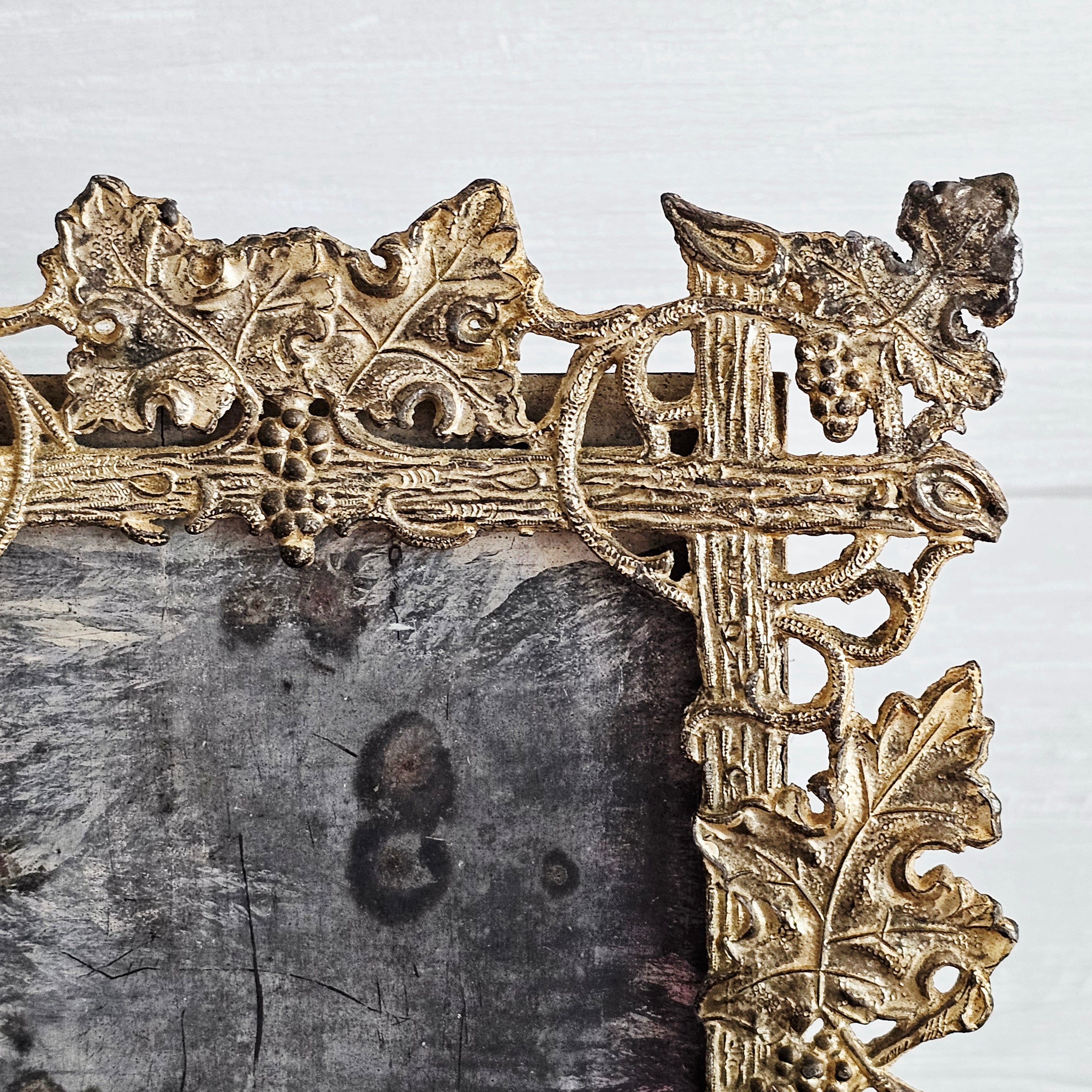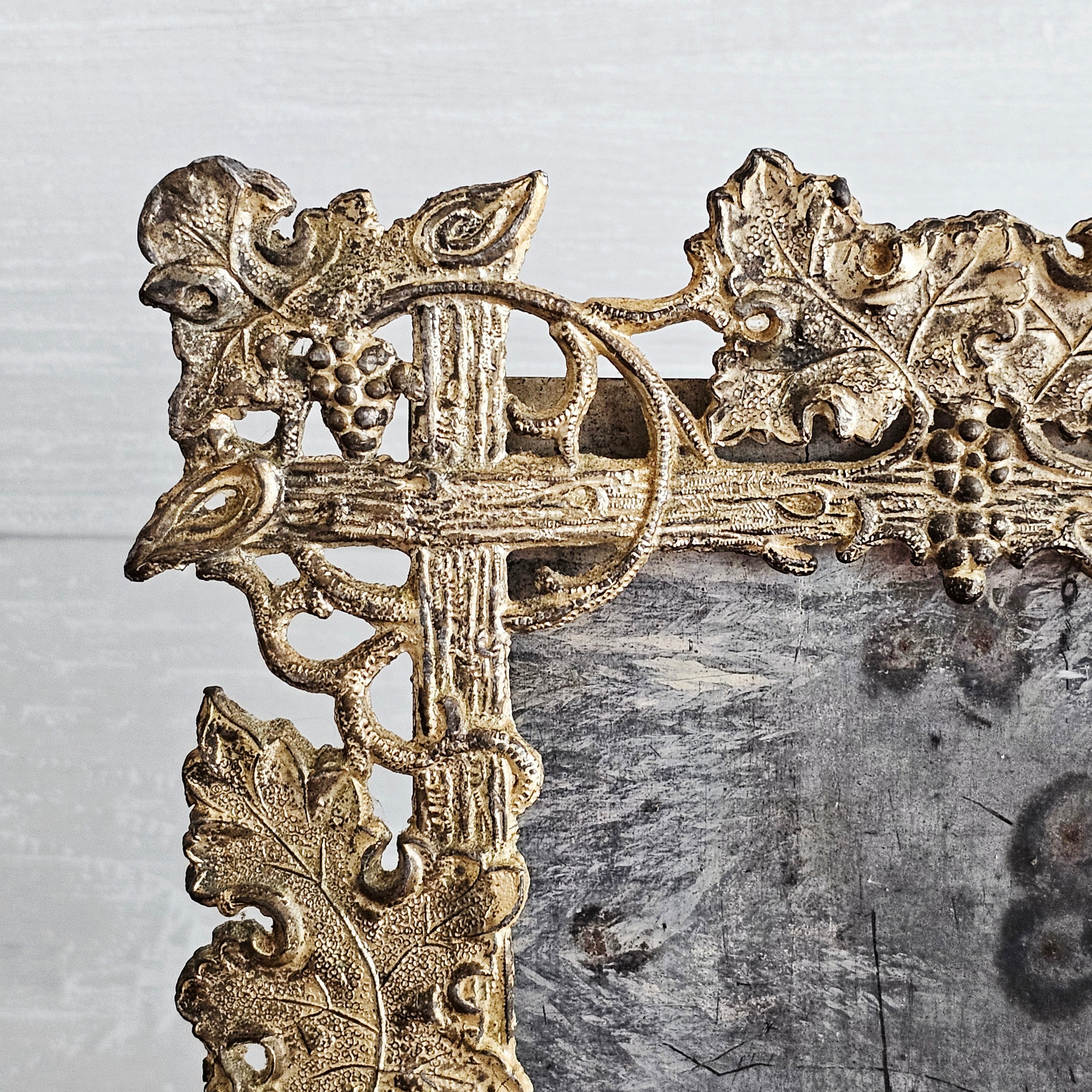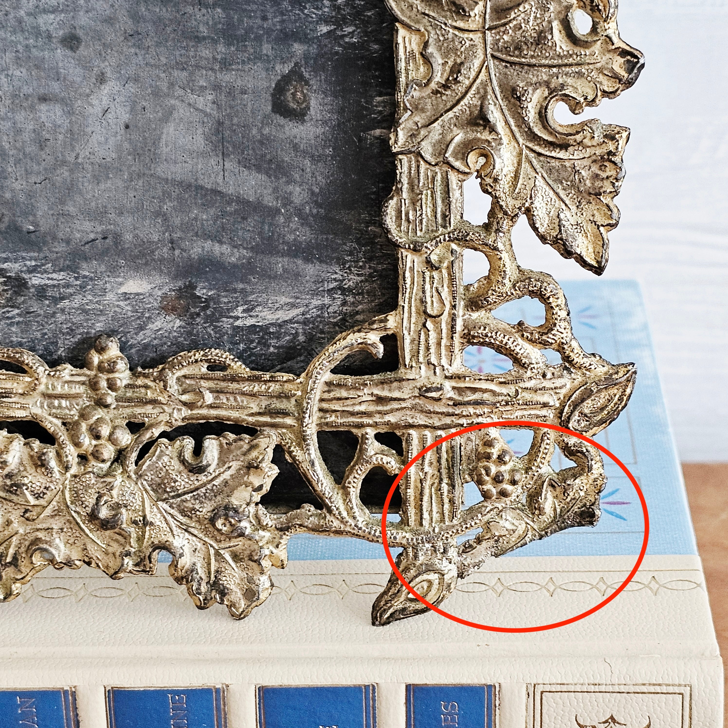 - It is in good antique condition with some signs of wear and lots of patina. A piece is missing in the bottom right corner of the frame. Please see the pictures for more details.